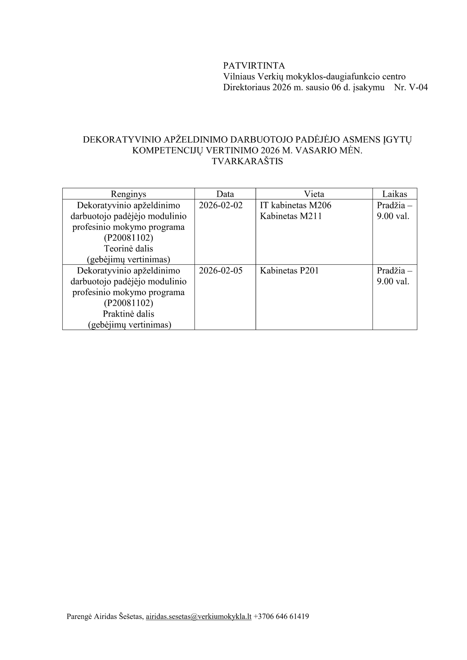 23 Jan Dekoratyvinio apželdinimo darbuotojo padėjėjo modulinės profesinio mokymo programos (P20081102) kompetencijų vertinimo tvarkaraštis – 2026 m. vasaris