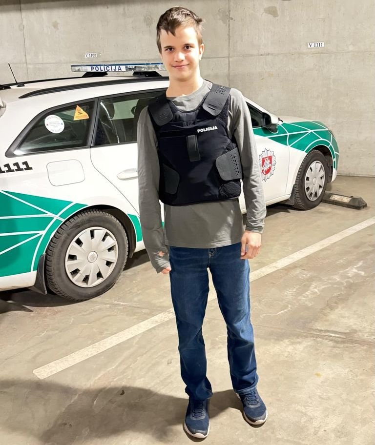 Mokinius pasitikusi Vilniaus miesto 1-ojo policijos komisariato bendruomenės pareigūnė Inga Silko supažindino su policijos komisariato erdvėmis, pristatė policijos pareigūnų veiklas, mokiniams parodė kur vyksta apklausos. Mokiniai apsilankė sulaikymo kameroje, policijos automobilių stovėjimo parke. Jie pasimatavo policininko apsauginę liemenę, sėdėjo už policijos automobilio vairo, net įjungė sirenas ir švyturėlius. Mokiniams patiko ši išvyka, klasėje jie dalijosi įspūdžiais apie sudėtingą ir atsakingą policininko profesiją.