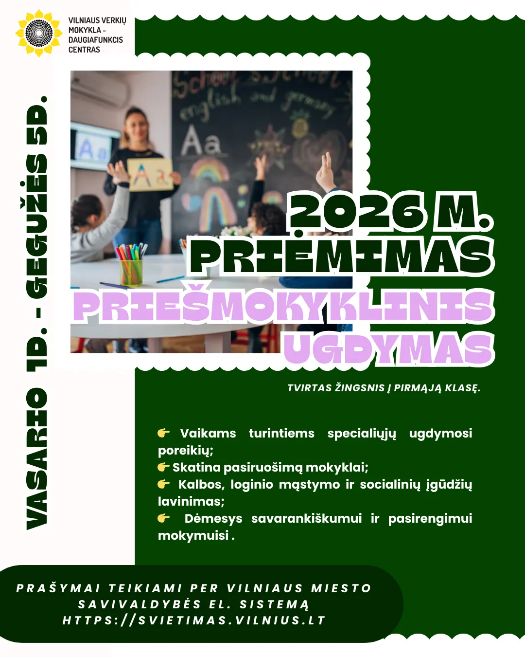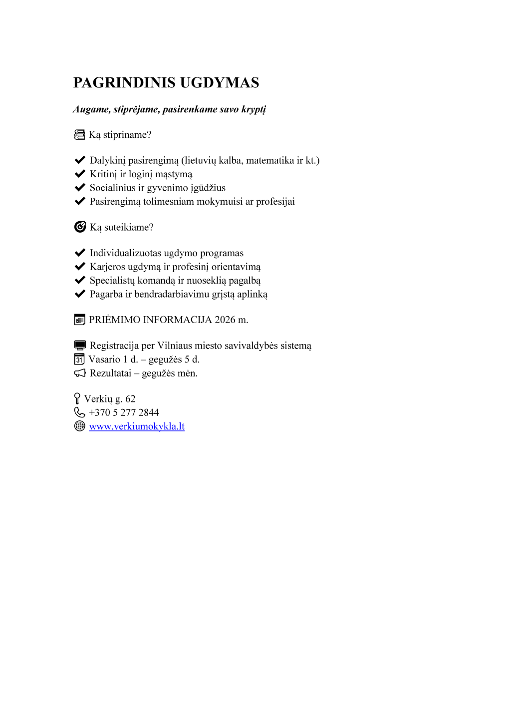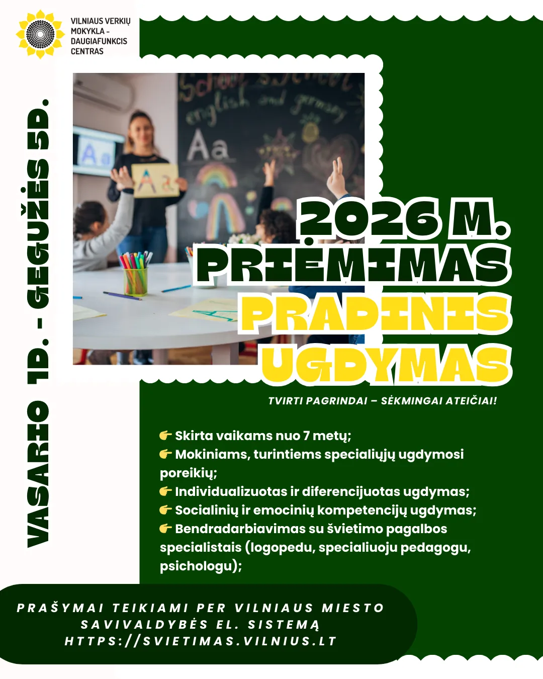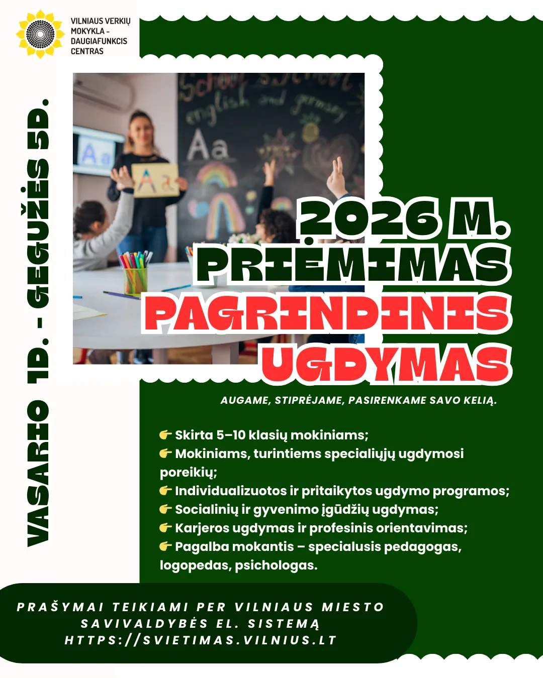 Informuojame, kad prašymus dėl mokinių priėmimo į Vilniaus Verkių mokyklą-daugiafunkcinį centrą 2026–2027 mokslo metams galima pateikti nuo 2026 m. vasario 1 d. iki gegužės 5 d. elektroninėje prašymų registracijos sistemoje https://svietimas.vilnius.lt