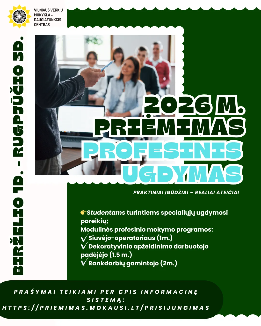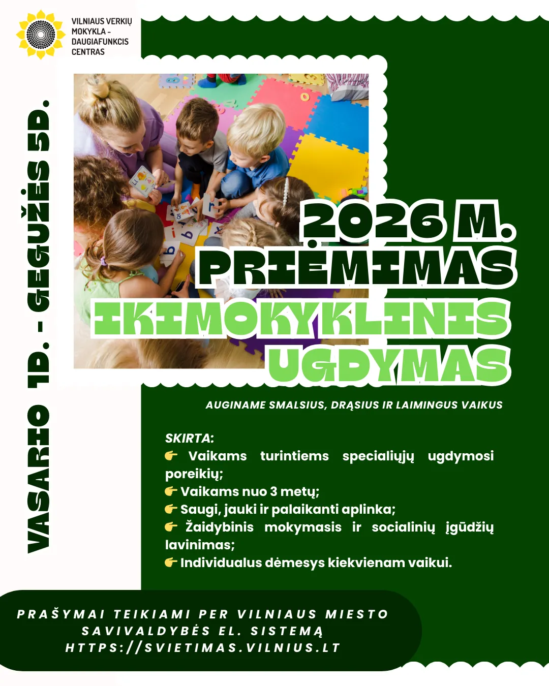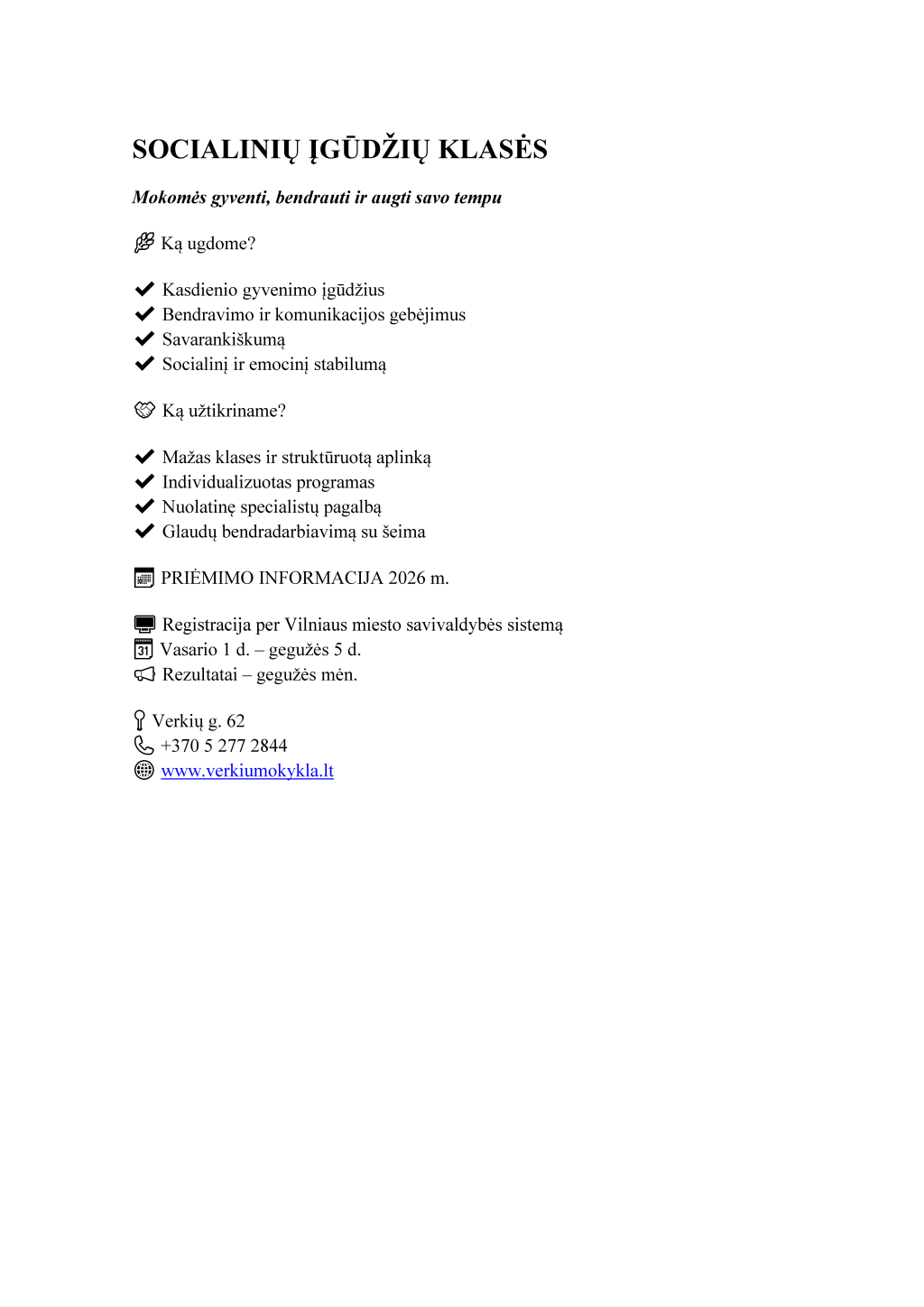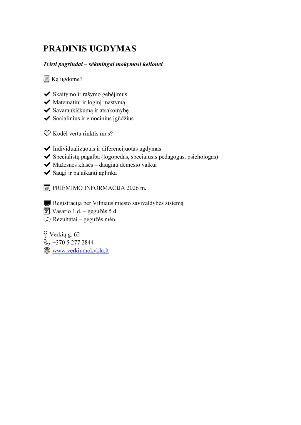 Informuojame, kad prašymus dėl mokinių priėmimo į Vilniaus Verkių mokyklą-daugiafunkcinį centrą 2026–2027 mokslo metams galima pateikti nuo 2026 m. vasario 1 d. iki gegužės 5 d. elektroninėje prašymų registracijos sistemoje https://svietimas.vilnius.lt