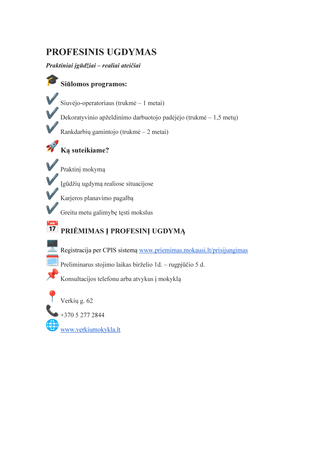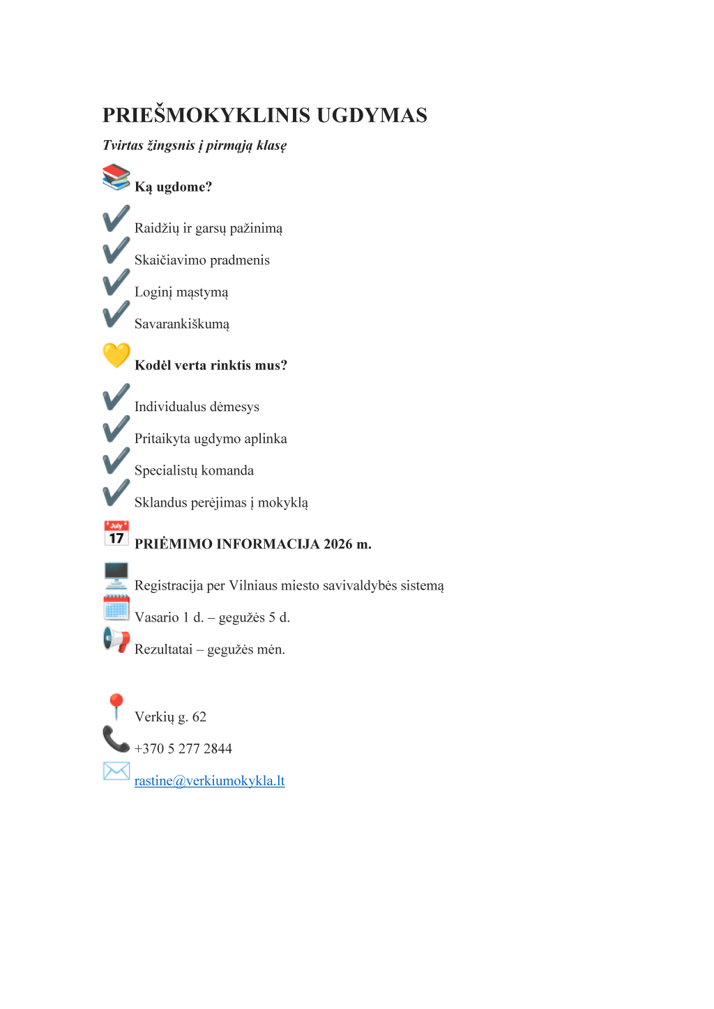 Jei turite klausimų drąsiai kreipkitės į mokyklos direktorių Šarūną Gerulaitį (+370 607 75611, sarunas.gerulaitis@verkiumokykla.lt) arba direktoriaus pavaduotoją ugdymui Jurgitą Ivaškevičienę (+370 674 40823, jurgita.ivaskeviciene@verkiumokykla.lt).