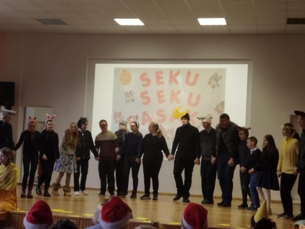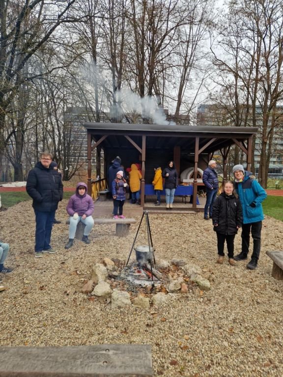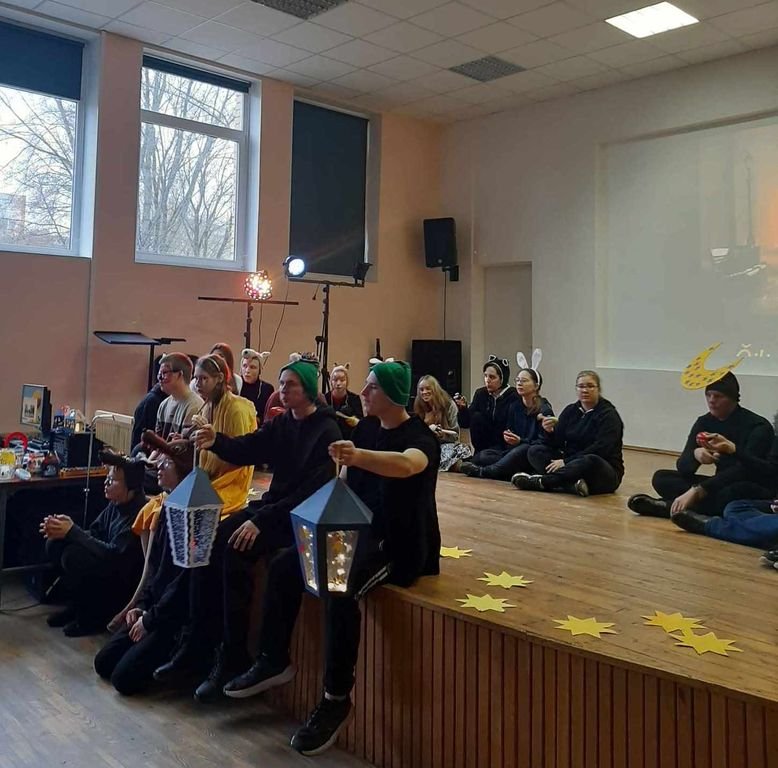 Po muzikinės pasakos mokiniai, pasiėmę šviečiančius žibintus, iškeliavo į mokyklos kiemą, kur užkūręs laužą, prie lauko virtuvėlės visų laukė mokytojas R. Kriščiūnas, su karšta mėtų-čiobrelių arbata – mokinio padėjėja Ž. Sokolovienė. Mokiniai dalinosi vieni su kitais karšta arbata, skanėstais prie jos, šviesa ir šiluma, gera nuotaika.